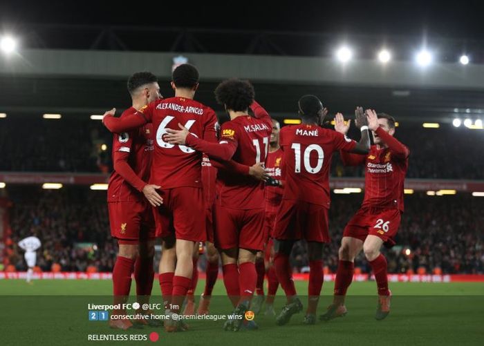 Selebrasi pemain Liverpool usai kalahkan West Ham 3-2 di Anfield pada pekan ke-27 Liga Inggris, Senin (24/2/2020) atau Selasa dini hari WIB.